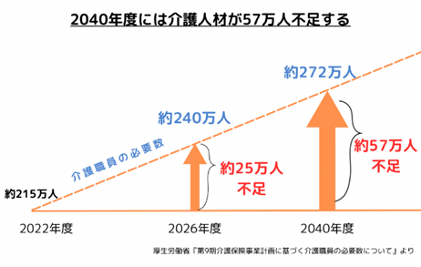 厚生労働省のデータによれば、来年(2026年度)には約240万人、2040年度には約57万人の介護職員が不足するといわれているそうです。