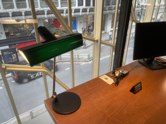 こちら、窓に面した一人用席のデスクです。このT字型の照明は古くから銀行で使われてきた「バンカーズランプ」。お金を取り扱う緊張感を少しでも和らげるために落ち着いた緑色をしているのだそうで、このグリーンとSMBCのコーポレートカラーがあいまって、自然に内装はグリーンでまとまったとのこと!カフェもグリーンだからぴったり!