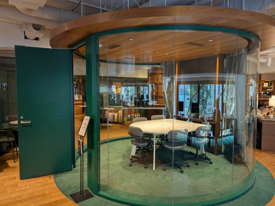 丸くガラスで囲われたスケスケ会議室!カーテンで視線を遮ることができます。