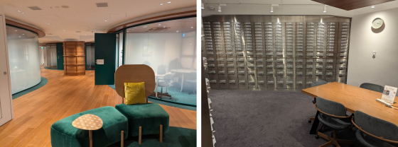 ▼オープンスペースのほか数名で使える個室も。右は貸金庫をリノベーションしたスペース、銀行ならではです!