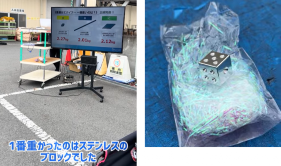 続いては、実際の金属部材を手に取ってもらう重量クイズ。