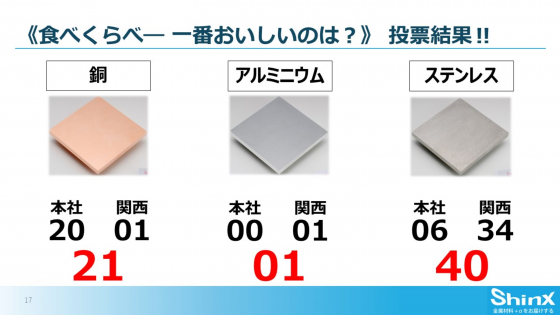 ステンレス・アルミ・銅、3種類の金属プレートで焼いたお肉を食べ比べ、どれが一番おいしいかを投票したんですって!