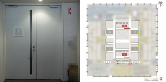 非常時の動線を出入口のドアに表示。