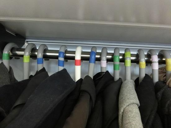どの色のハンガーに掛けたかを覚えておくだけで、自分のコートを探す時間を削減できます。