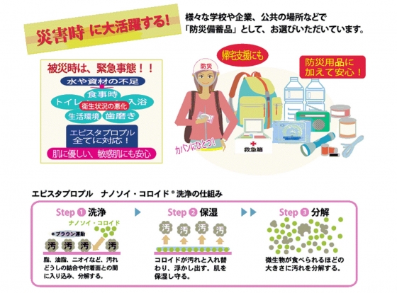 もしもの災害に遭ったとき、避難生活が長引けばだんだんと不安になってくるのが衛生面。タオルを濡らしたりするにもお水は貴重ですよね。そんなときに歯も磨けるウェットティッシュがあったら・・・除菌ウェットティッシュではデリケートゾーンはちょっと抵抗があるけど、このエピスタプロピルはノンアルコールだから、デリケートな女性や赤ちゃんの肌はもちろん、歯も磨けるのです。