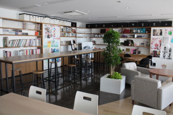 奥の一角にはBARっぽいゾーンも。棚には印刷会社らしいサンプルがたくさんディスプレイされてるから、紹介しながら打ち合わせできちゃう。