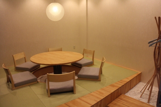 反対側には3つの会議室。一つはこんな和風なお部屋「若葉」。”靴を脱げる場所がほしい”という女子社員の希望から生まれたんだそう。玉砂利なんか敷いてある~