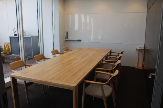 自然光が入る窓側の会議室は「琥珀」というお部屋。木目の什器がやさしい。