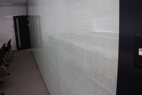 このエリアには一番奥の社長室までの間に応接室がずらり。目隠しガラスは、内側と外側からタテ方向とヨコ方向にシートを貼っているんですね。なるほど~