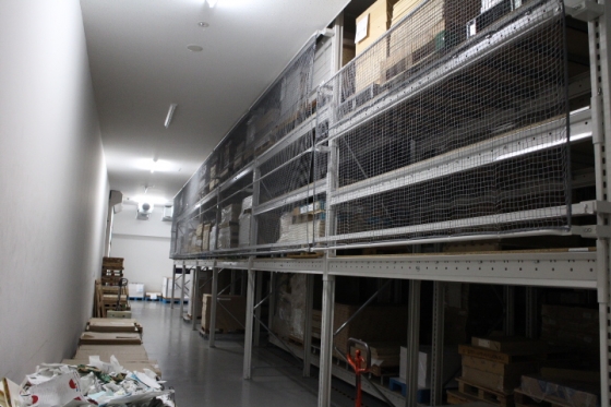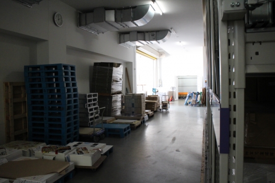 隣には用紙&製品倉庫。床から天井までびっしり。これから納品される完成品もたくさんここに。ん、明るい光が差し込む奥のほうへ行くと・・・?