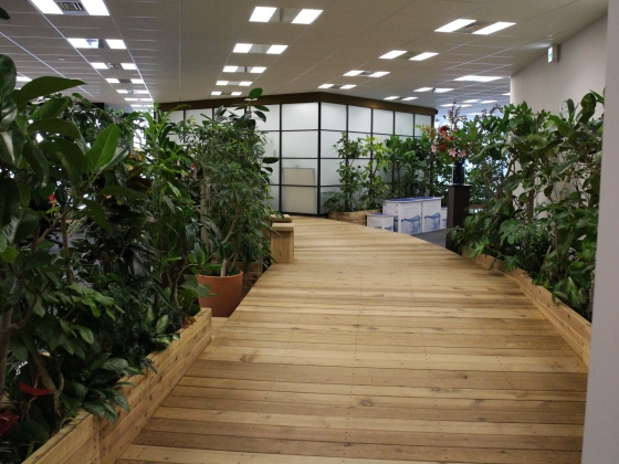 コツコツと歩いてるとなんかバカンスにきてバンガローに到着!みたいな気分になってきます♪ここからは社内全体が見渡せて、皆さんも来客者にご挨拶してくれます。