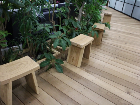 通路に沿って、かわいらしいスツール。国産の杉でできているそうですよ。