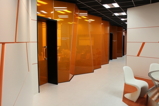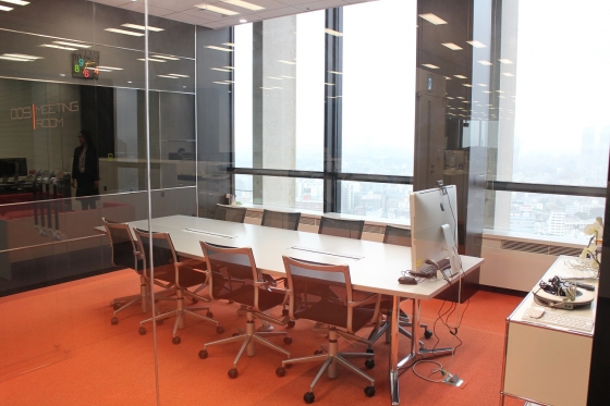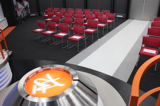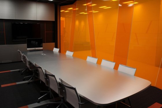 執務室内の会議室はホワイトでなくブラックボード。オレンジ一色のカーペットが眩しい