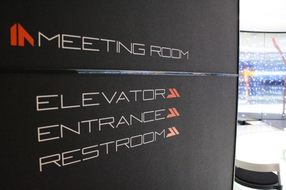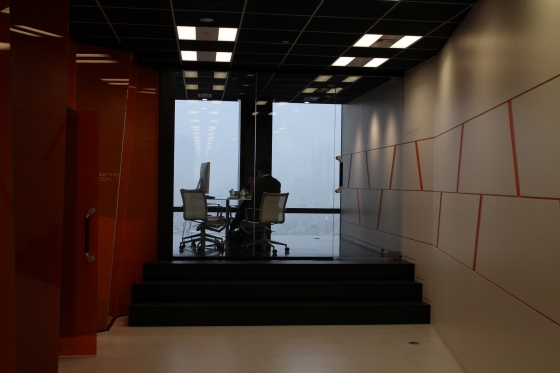 廊下の一番奥に一段高くなった会議室!学生向けにセミナーやったりするので印象に残るように、ってこりゃインパクト大でしょ!!