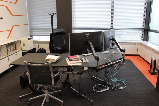 その隣に社長さんのデスク。モニター三つ!!!