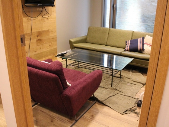 反対側の通路にはソファとローテーブルの会議室が3つ。リビングにいるような雰囲気ですね。