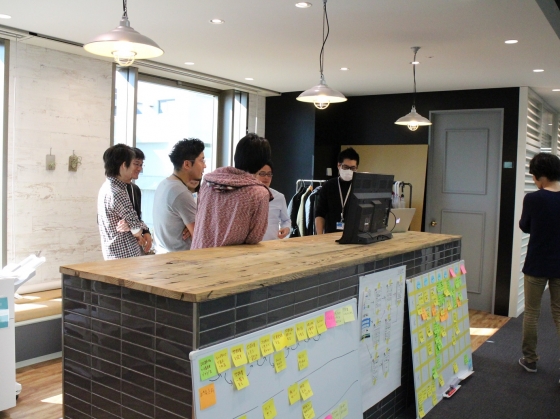 窓際では何やら立ちミーティングが行われていました。内製開発のエンジニアさんたちのようです。