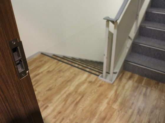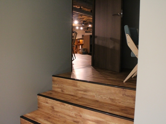 階段までフローリングに張り替えるこだわり。一番下から上がってきたとき、自分の階に来たことが一目でわかって便利かも。