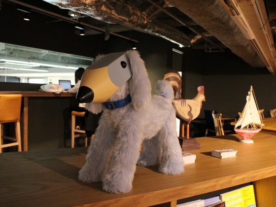 初めに通された社内の会議室「ブレストルーム」は、大きなテーブルはなく椅子ばかり。フランクにブレストができるようになっている。壁の絵もそれっぽいですよね、「これまでの常識をぶっ壊す!」みたいなメッセージなんだとか。(ウソです)