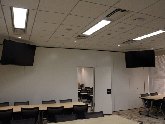 こちらは普段は打合せスペースなどに使っているけど、パーティションをはずすと広げて使えます。広げたときに後ろの席の人からはスクリーンが遠く見えづらいので2枚のモニターで対応。親切!