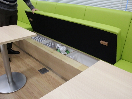さっと打合せできるスペースをたくさん作ったのも今回のポイント。グリーンのチェアの座面の下には災害用飲料水を収納。