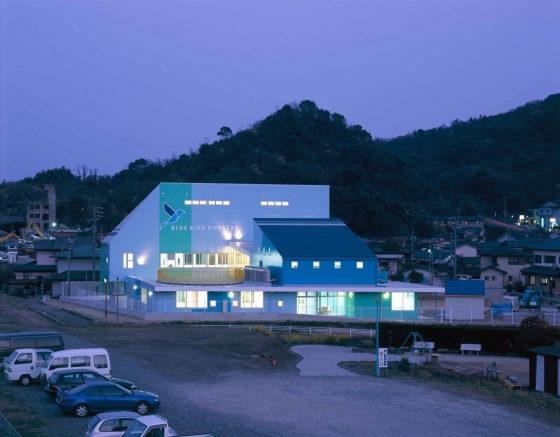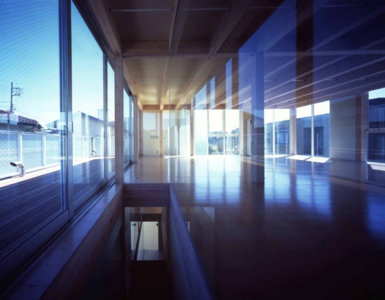 駅前に立つ保育園は4色のブルーを使った外観。ちっちゃい、かわいい、というイメージではなく、電車から見ても目立つように、また「おうち」のイメージを取り入れたいとのオーダーから、片流れ屋根を2つ組み合わせて、天井を高く作った。一瞬、保育園とはわからないような外観である。中庭のまわりに0~2歳児、園庭側に3~5歳児の部屋。園児が最長6年間を過ごす場所となるため、成長に合わせて居場所を変えられるよう配置を配慮。