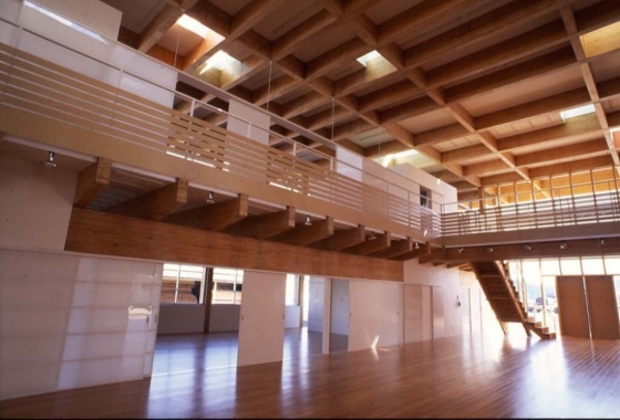 ずっと社内で内勤している女性のために、ロッカーや給湯室や食堂や執務室をそれぞれわざと離して、社内を動き回る仕掛けに。支社を含めた全社員で朝礼や展示会などに活用できる大きなスペースを中心に設けた。大断面集成材(接着剤で張り合わせて、強度を均一にした構造用木材)を使用し、新しい木の使い方を提案した。全体にオープンな空間にしたことで、他の課の動向がわかりやすくなったとの声があり、その後訪問したときは卓球台がおかれていて、今までにないアクティビティが生まれていた。