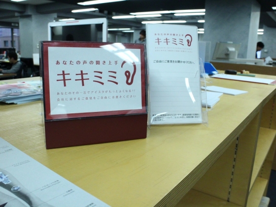 代表的なもので「キキミミ」といって、会社改善の意見や要望を社員から募る目安箱を、一昨年設置しました。社員が無記名で投稿できるシステムです。月に5~6件入っていて、ひとつひとつきちんと回答を用意し、月一度の全社朝礼で発表していました。ただ、結構クレームというかネガティブな意見が多かったというのも事実です。