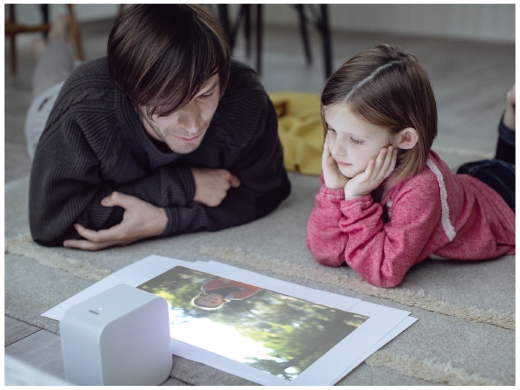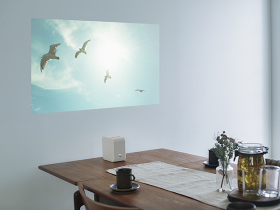 壁からプロジェクター本体までの距離によって投写画面のサイズを変えられ、壁から約28センチ離すだけで、最大80インチの大きさで映せます。