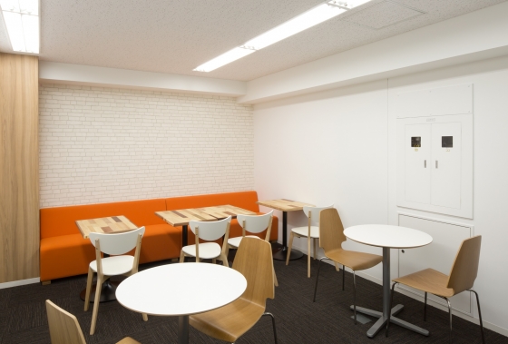 天井部分の一部にデスク面と同色の木目を入れたり、柱にコーポレートカラーであるオレンジを利用したり、明るい雰囲気を感じます。