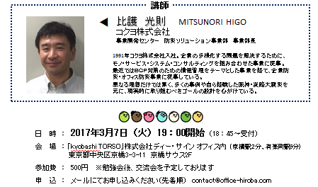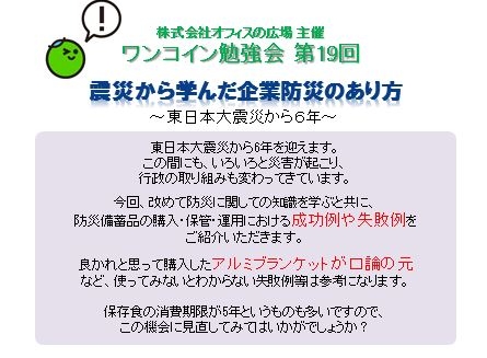 『震災から学んだ企業防災のあり方』 ■日 時:2017年3月7日(火)19:00~(受付18:30~) ■場 所:kyobashi TORSO 中央区京橋3-3-11 東京メトロ京橋駅2分、JR有楽町駅6分 ■参加費:500円 *交流会も併せて予定しております。 ++++++++++++++++++++++++++++++ お申し込みはこちら→ contact@office-hiroba.com お待ちしております!!! |