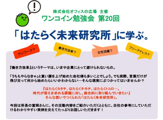 今回第20回を迎えるワンコイン勉強会では、今や企業にとって避けては通れない課題、「働き方改革」について、「はたらく未来研究所」の所長・富岡さんに、その活動内容をご紹介いただくとともに、自社の参考にしていただけるわかりやすい実例を交えてたっぷりお話しいただきます!