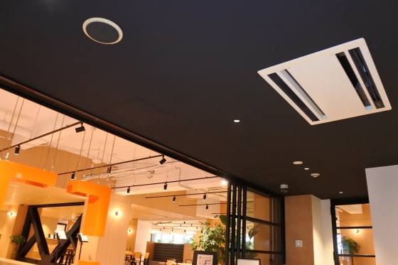 エレベーターホール部分の天井だけが黒くペイントされており、より室内が明るく見える演出になっていますね。