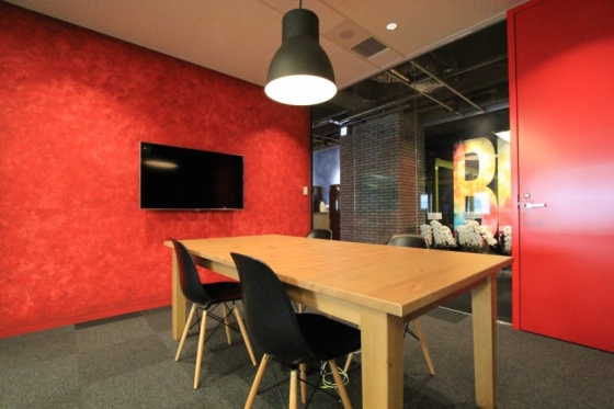 次のお部屋は真っ赤な壁とドアが印象的なMTGルーム。黒いチェアにウッドのテーブルで意外に落ち着きます。ガラスの向こうにはド派手なロゴアートが見えます。