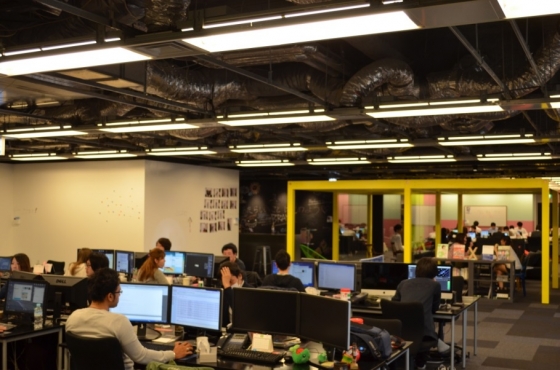 執務スペースの雰囲気はこんな感じ。手前は開発部の方々。中央に黄色いやぐらがあって、その奥が営業部です。