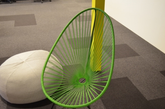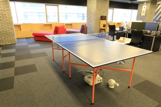執務室内に戻りました、なんと開発部さんと黄色いやぐらの間には卓球台が・・・!この付近はリラックスゾーンですね。仕事の合間の気分転換によく、卓球されているそうです!