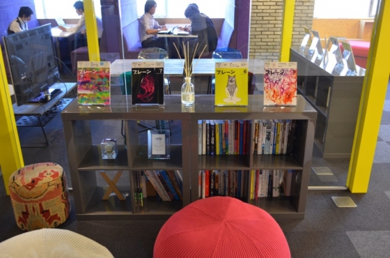 窓側にはファミレス風の打合せスペース。どきっとするようなカラーリングだけど、半個室になってて落ち着けるから、重要なミーティングもよく行われているとか。