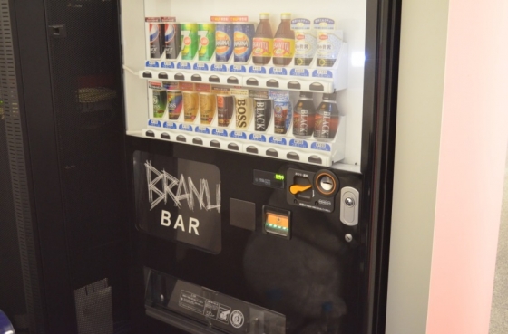 はい、きました、社名のロゴが施された、オリジナル感たっぷりなブラックの自販機。クールですねー!