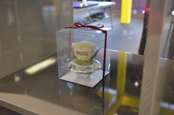 かわいらしいアレンジが施された、「BRANU」ロゴ入りの白いバラ。取引先様からのいただきもの、とのこと。愛を感じますねぇ。