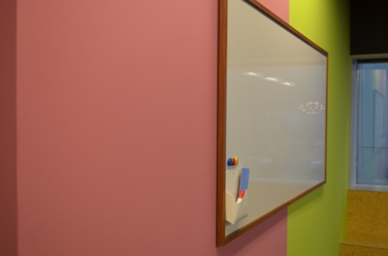 廊下のスカルマークとは好対照な、パステル配色の優しいトーンの壁。