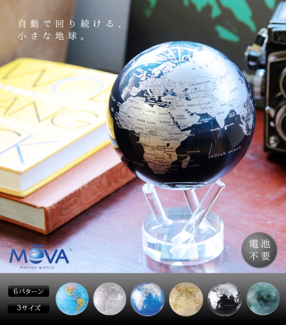置いたままでも回って見えるのは、球が二重になっていて、内側だけが回るしくみだから。自動でゆっくり回る様子を眺めていたら、だんだん仕事のやる気が出てくるかも。さぁ事業拡大、世界に進出だ!ってね。