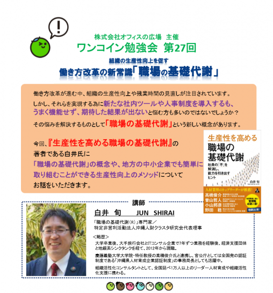 勉強会では、「職場の基礎代謝」の概念や、地方の中小企業でも簡単に取り組むことができる生産性向上のメソッドについてお話をいただきます。