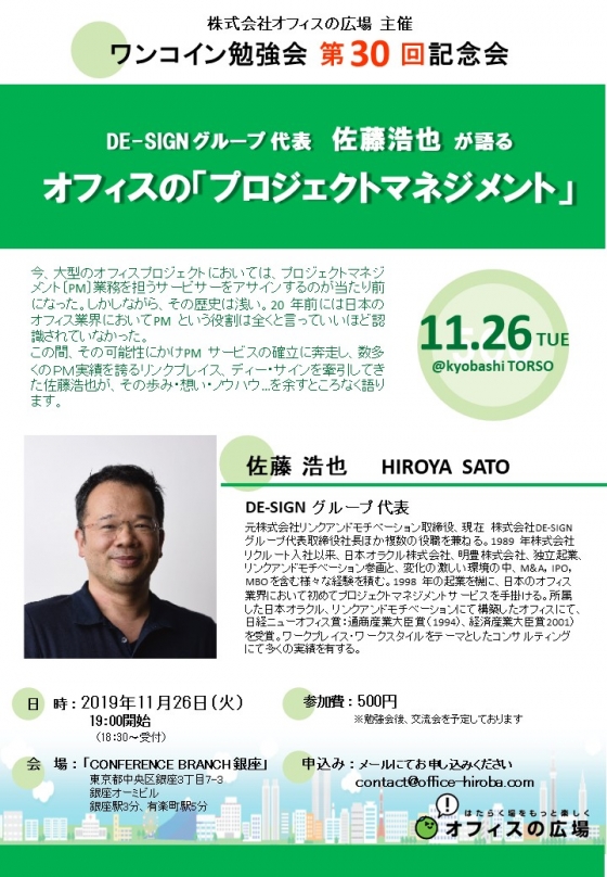 | Information | 日 時 : 2019年11月26日(火)19:00開始(18:30開場) ※会場が変更になりました※ 会 場 :東京都中央区銀座3丁目7-3 銀座オーミビル CONFERENCE BRANCH銀座 http://www.kensyu.com/cb/ginza/access/ 参加費 : 500円 ※勉強会後は名刺交換を中心とした交流会を予定しております。(その後近隣にて懇親会を予定) 申込み : メールにてお申し込みください contact@office-hiroba.com ※「ワンコイン30」と件名に入れてください |