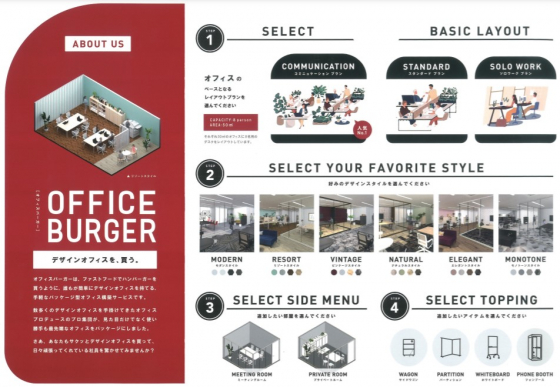 ベースとなるレイアウト、デザインスタイルから好きな組み合わせをチョイスし、申込みをするだけ!デスクやチェア、棚といった家具だけでなく、そのデザインに合わせたカーペットや壁紙などの資材もセットになっているんです。追加メニューもそろっているから人数規模、働き方に合わせていろいろセレクトできて楽しそう♪