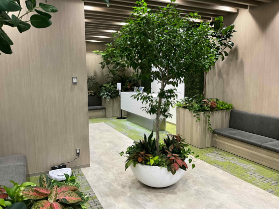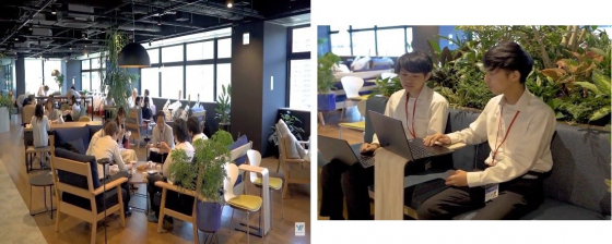 旧オフィスにはほとんどなかったグリーンをふんだんに取り入れ、バイオフィリック効果抜群♪すべて本物のグリーンだそう。