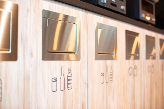 スタイリッシュなゴミ箱はオリジナルだそう!しかもソフトクローズという配慮!ゴミ箱のばたんばたんする音、プチストレスですよね~