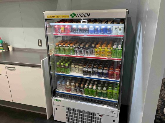応接エリアには種類豊富なドリンク用冷蔵庫があって、各自選んでお客様へ提供。これで受付対応は100%不要となりました。