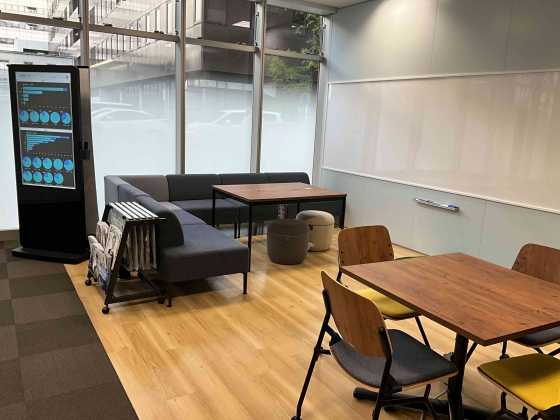 フリースペースは社員同士のミーティング、ランチなどに活用。デジタルサイネージではリアルタイムで業績などをチェック。出社状況の確認もできるため、コロナ下では大活躍ですね。