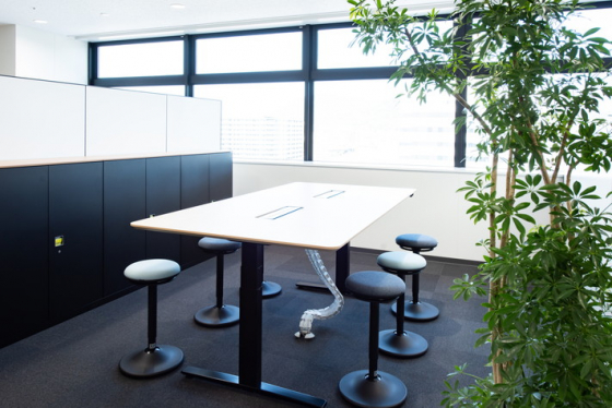 こちらは昇降テーブルで立っても座ってもミーティング。椅子はわざとゆらゆら揺れるもので座りっぱなしを回避。