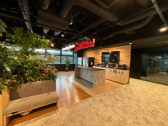 今回の移転の一番のこだわりポイントといえる社員専用コワーキングスペース、「SAKASSO!(サカッソ)」です!イノベーションを咲かせよう(咲かそう)という意味が込められています^^